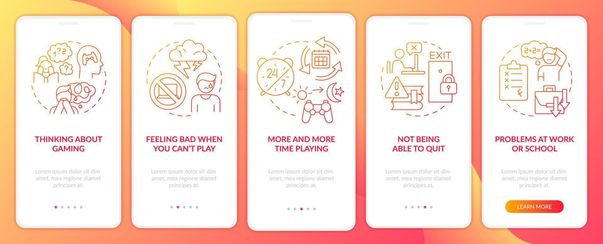 Signs of game addiction red gradient onboarding mobile app screen. Walkthrough 5 steps graphic instructions pages with linear concepts. UI, UX, GUI template. Pro Vector