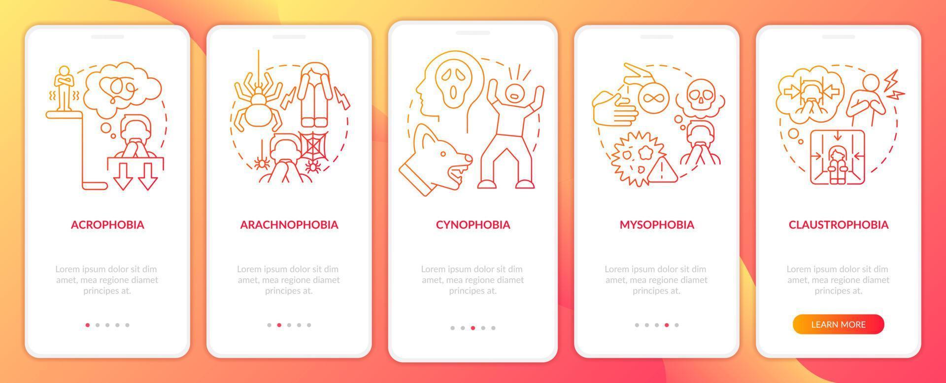 Most common phobias red gradient onboarding mobile app screen. Walkthrough 5 steps graphic instructions pages with linear concepts. UI, UX, GUI template. Pro Vector