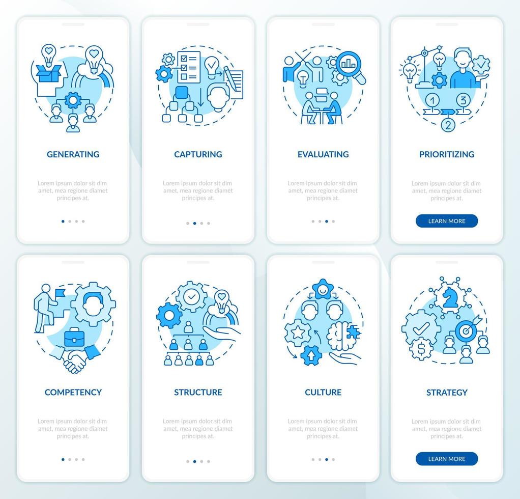 Innovation management structure blue onboarding mobile app screen set. Walkthrough 4 steps graphic instructions pages with linear concepts. UI, UX, GUI template. Pro Vector