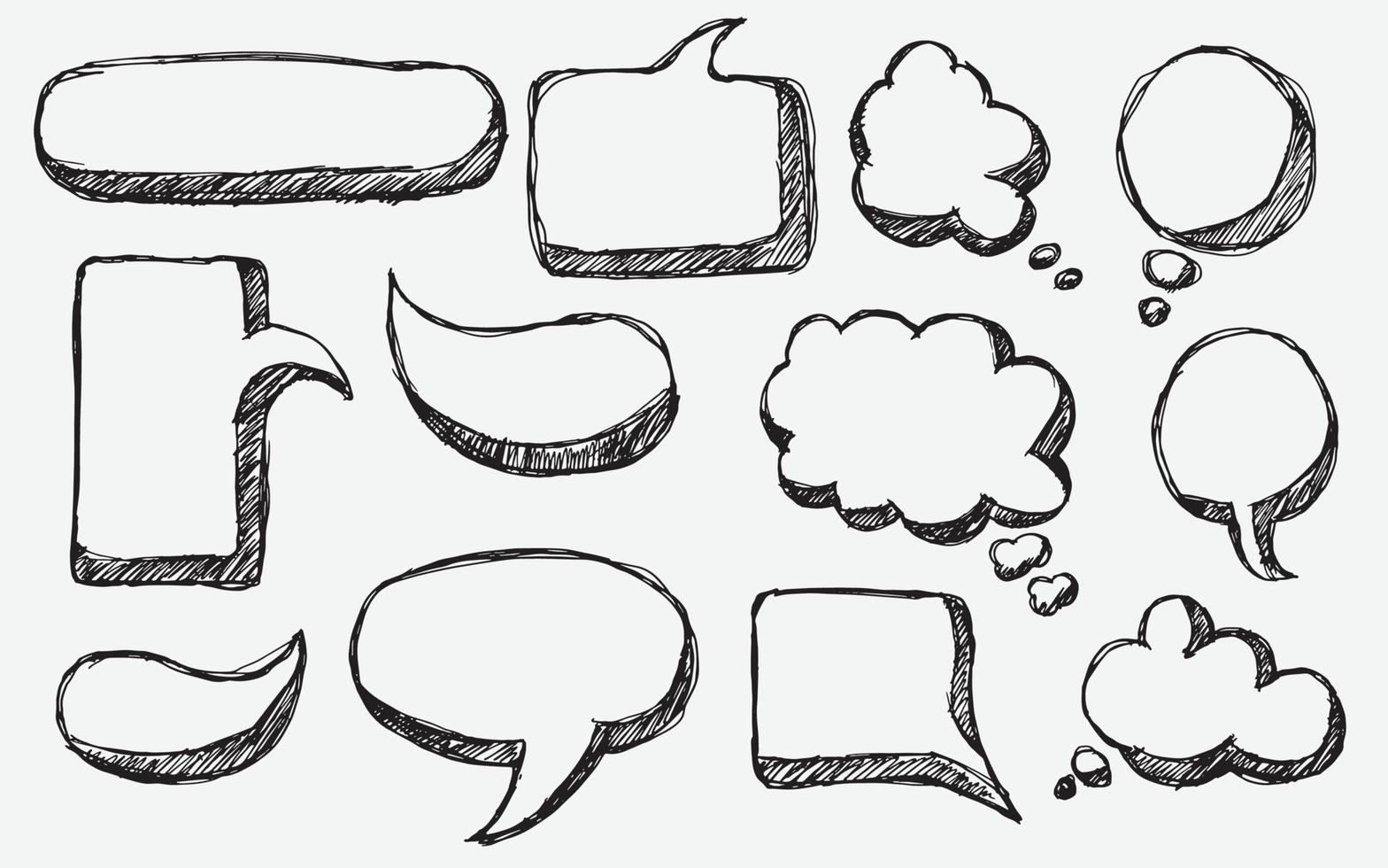 sketchy hand drawn thought and speech bubbles, empty speech bubble hand drawn doodle sketch of speech bubbles, text balloon set Pro Vector