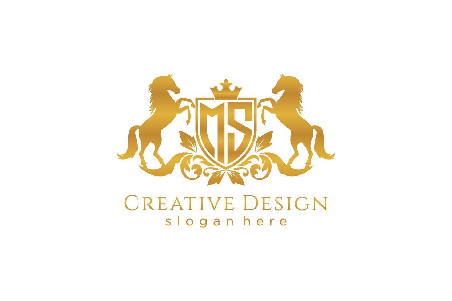 initial MS Retro golden crest with shield and two horses, badge template with scrolls and royal crown - perfect for luxurious branding projects Pro Vector and Pro SVG
