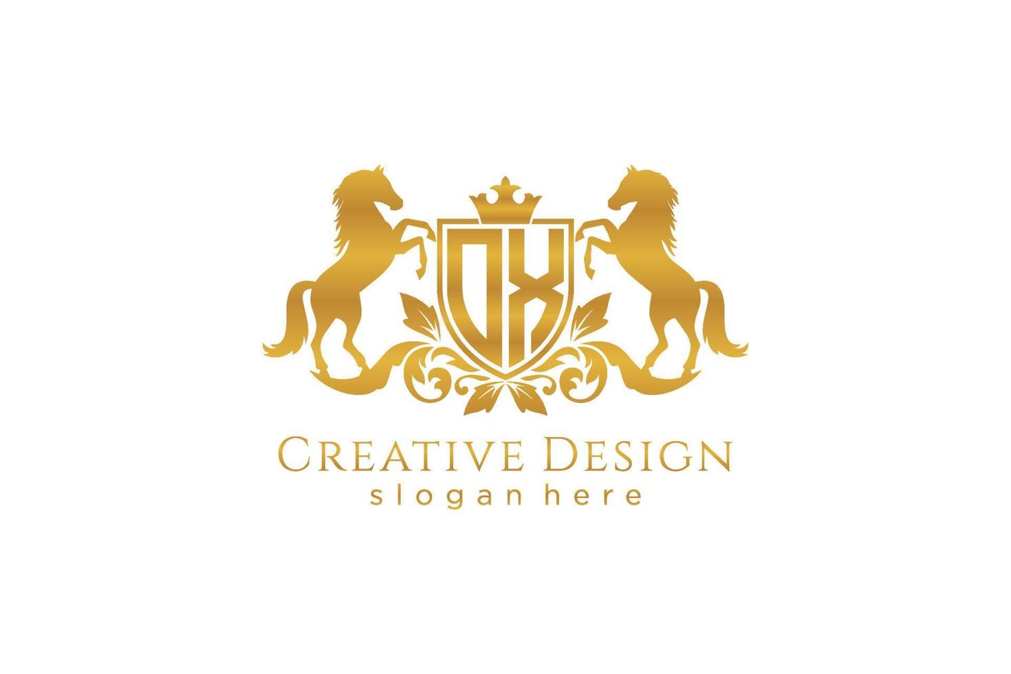 initial OX Retro golden crest with shield and two horses, badge template with scrolls and royal crown - perfect for luxurious branding projects Pro Vector and Pro SVG