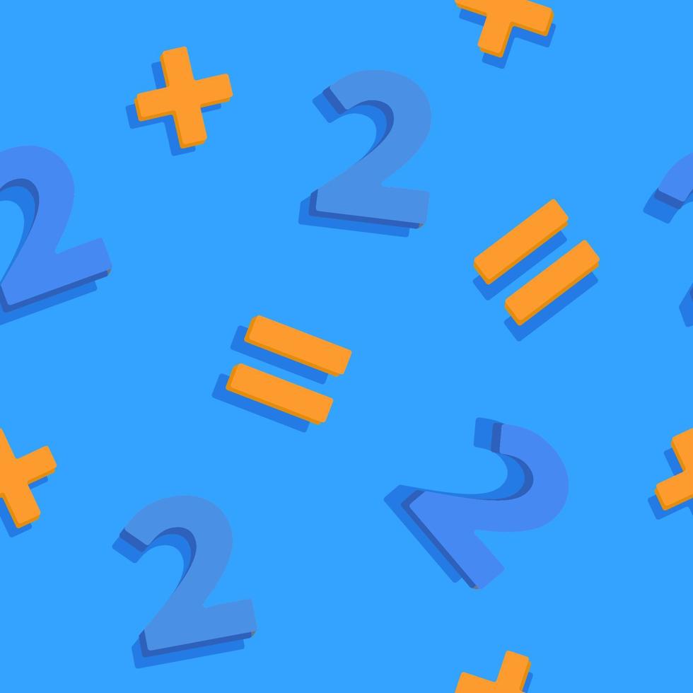 Two plus two seamless pattern. Blue numbers with orange arithmetic signs algebraic counting in mathematics business calculations and marketing vector operations addition in retail. Pro Vector