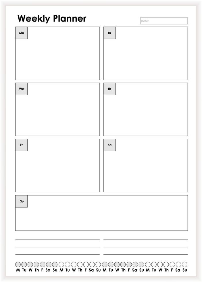 Simple black and white weekly planner paper sheet template vector flat illustration. Monochrome daily week schedule. Business calendar start from monday. Empty board with place for text Pro Vector