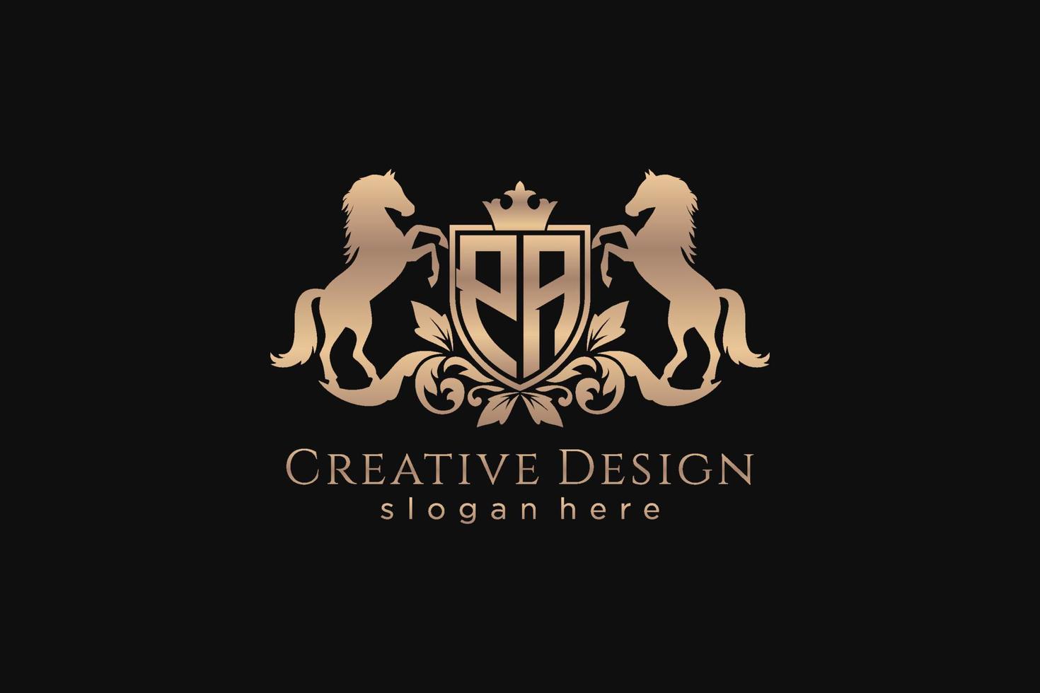 initial PA Retro golden crest with shield and two horses, badge template with scrolls and royal crown - perfect for luxurious branding projects Pro Vector and Pro SVG