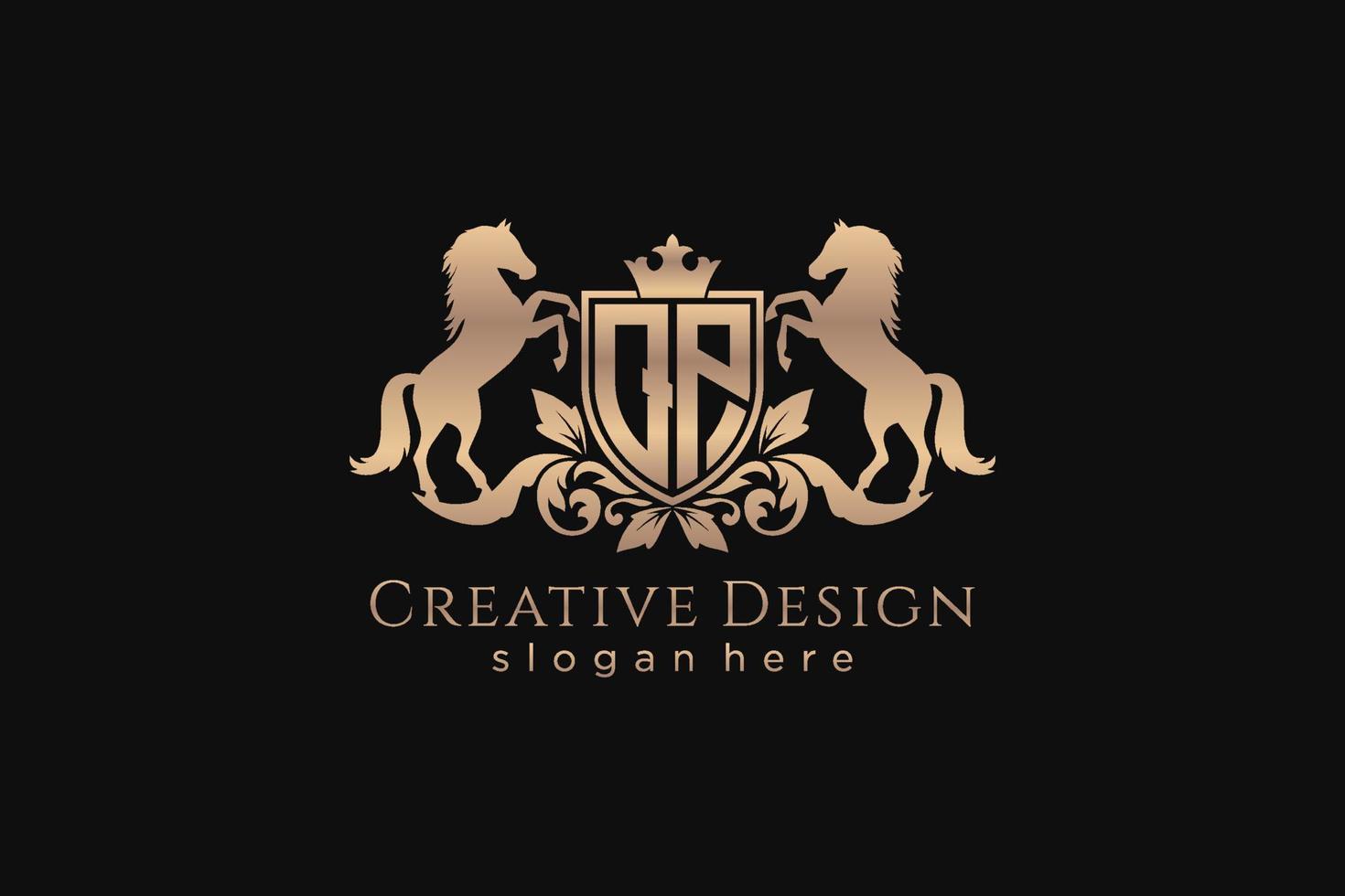initial QP Retro golden crest with shield and two horses, badge template with scrolls and royal crown - perfect for luxurious branding projects Pro Vector and Pro SVG