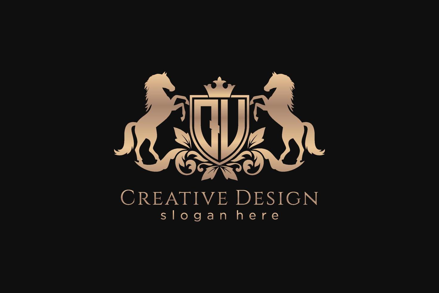 initial QU Retro golden crest with shield and two horses, badge template with scrolls and royal crown - perfect for luxurious branding projects Pro Vector and Pro SVG