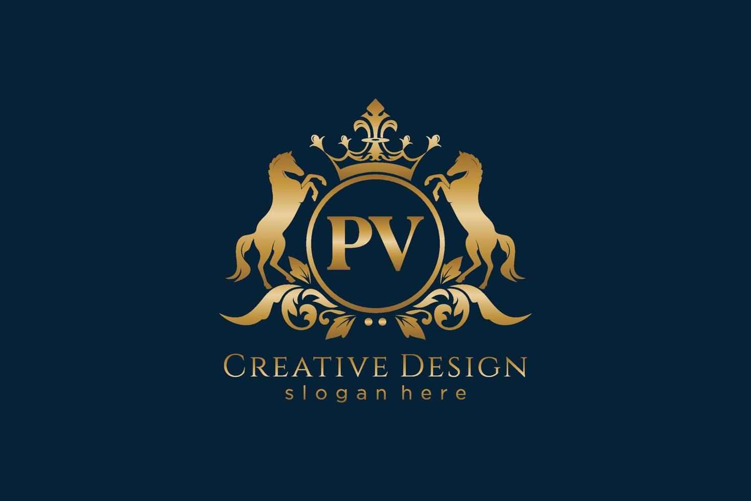initial PV Retro golden crest with circle and two horses, badge template with scrolls and royal crown - perfect for luxurious branding projects Pro Vector and Pro SVG