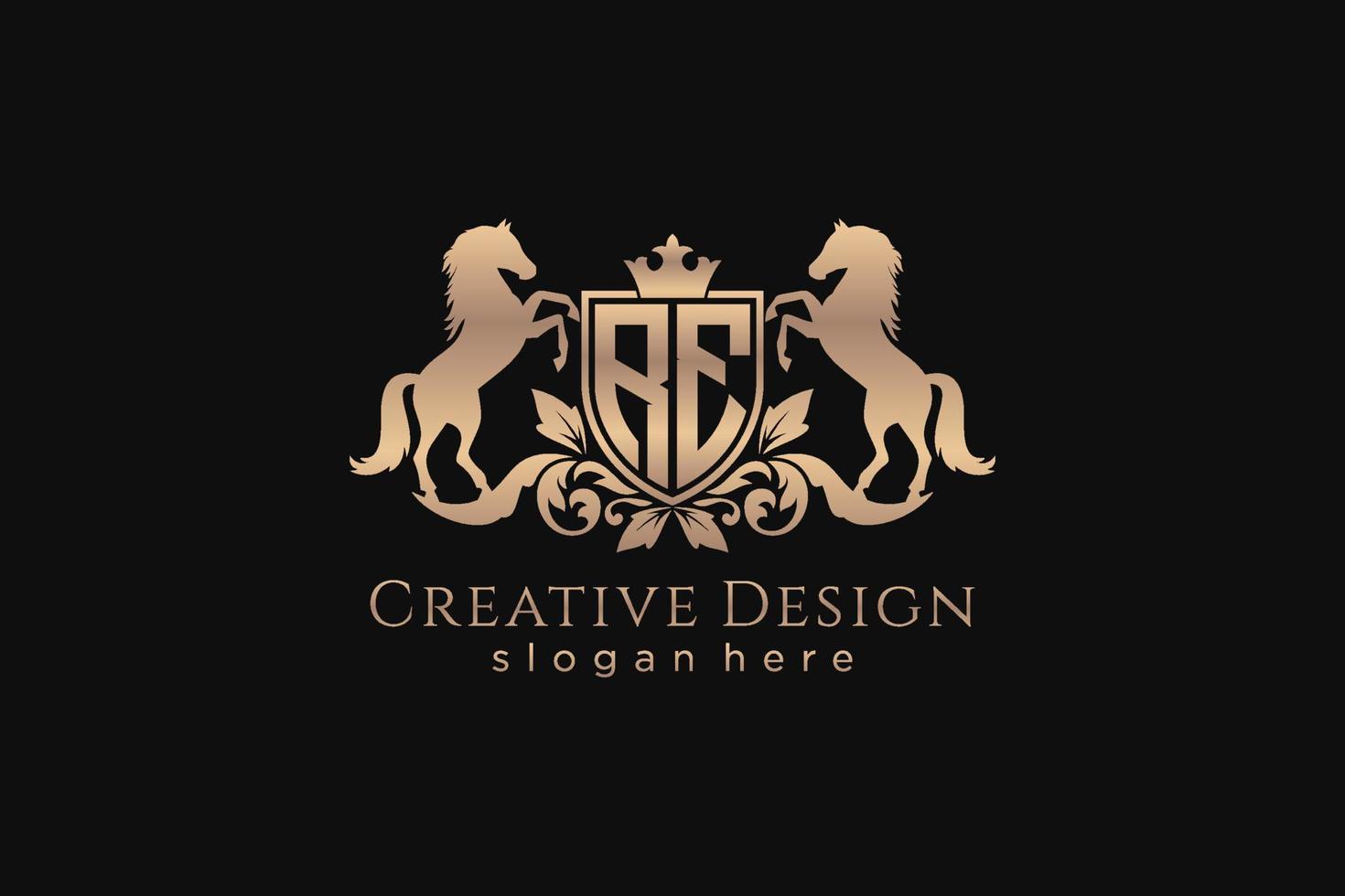 initial RE Retro golden crest with shield and two horses, badge template with scrolls and royal crown - perfect for luxurious branding projects Pro Vector and Pro SVG
