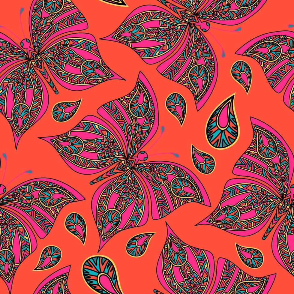 Seamless pattern with pink butterfly in zentangle style on red background. Pro Vector