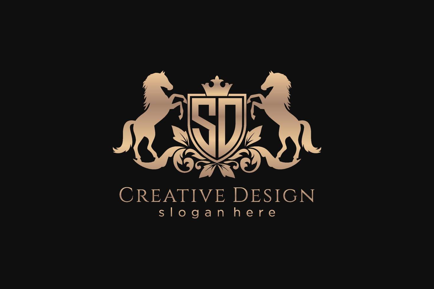 initial SO Retro golden crest with shield and two horses, badge template with scrolls and royal crown - perfect for luxurious branding projects Pro Vector and Pro SVG