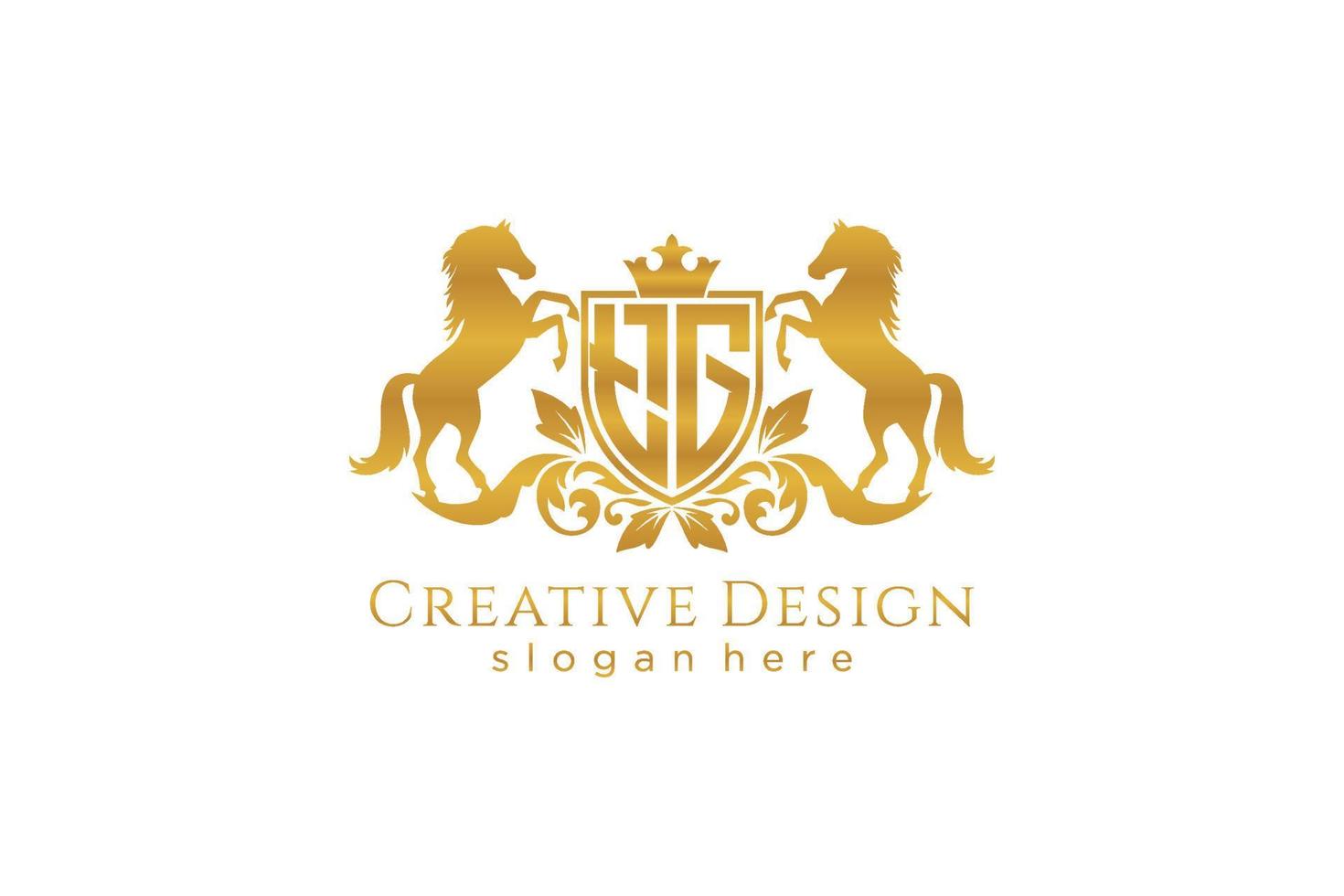 initial TG Retro golden crest with shield and two horses, badge template with scrolls and royal crown - perfect for luxurious branding projects Pro Vector and Pro SVG