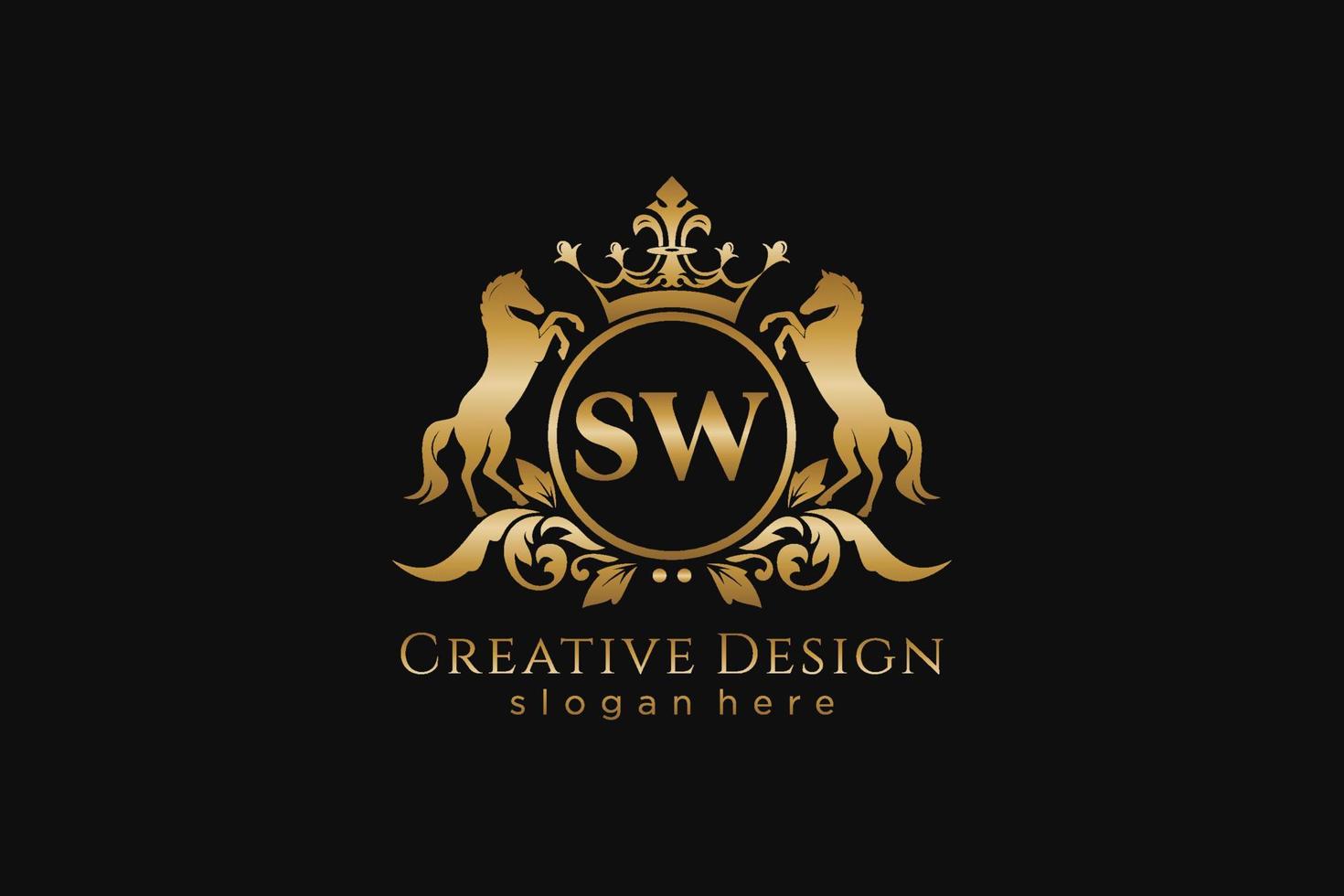 initial SW Retro golden crest with circle and two horses, badge template with scrolls and royal crown - perfect for luxurious branding projects Pro Vector and Pro SVG