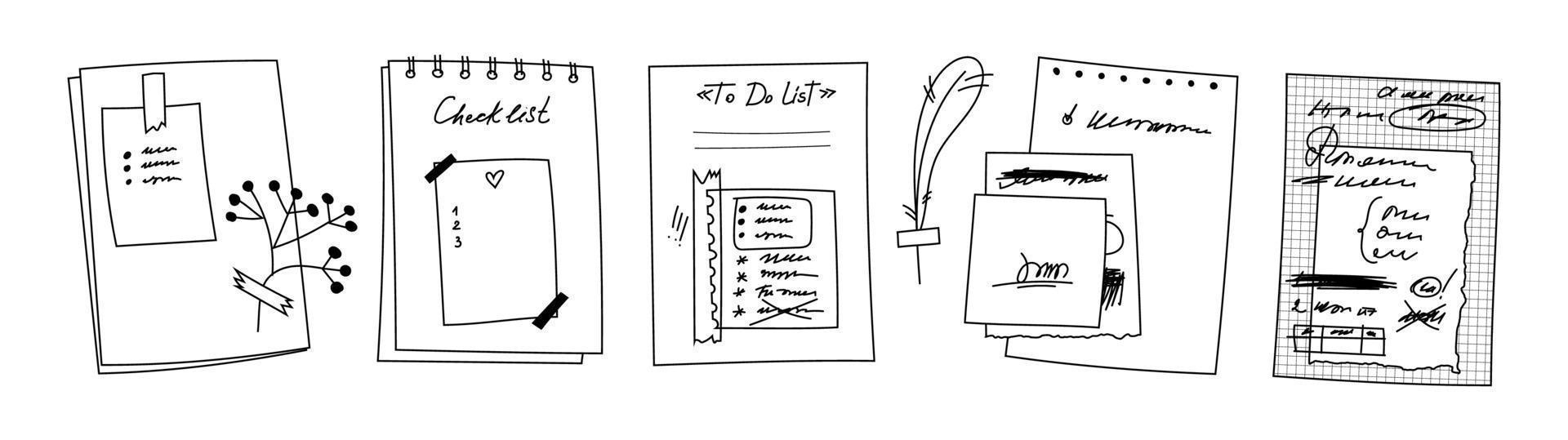 Cute paper sheets with notes underlined or crossed out. Hand-drawn notebook pages with memory stick and sticky notes, bird feather. Doodle handwriting in spiral notepad to-do list. Vector illustration Pro Vector