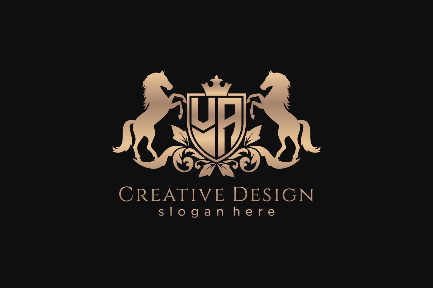 initial VA Retro golden crest with shield and two horses, badge template with scrolls and royal crown - perfect for luxurious branding projects Pro Vector and Pro SVG