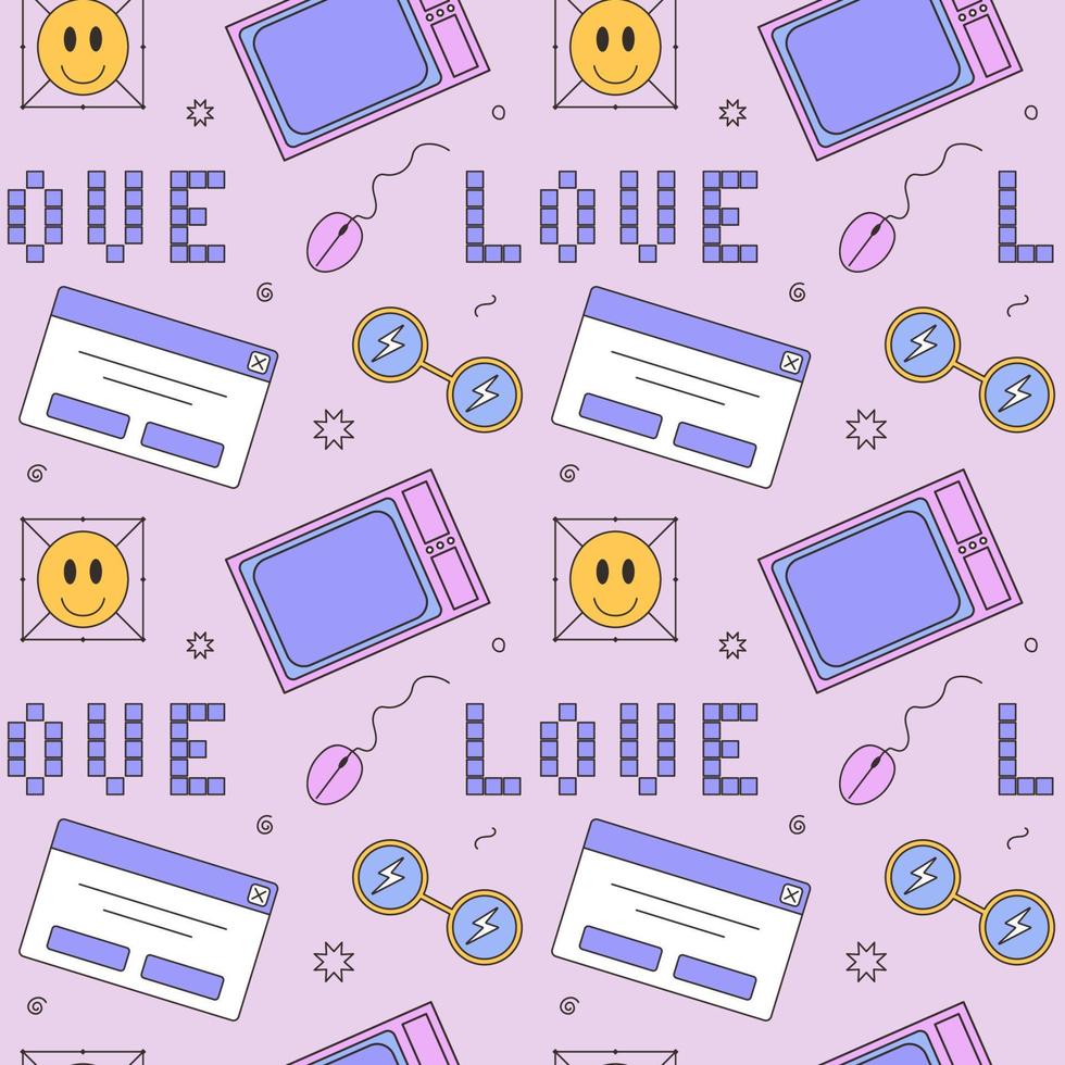 Seamless pattern of old computer window, glasses, computer mouse. Concept of 2000s, 1990s, 00s, Y2k aesthetic weird 2000 style. Groovy prints for tee, streetwear, print templates, textile. Pro Vector