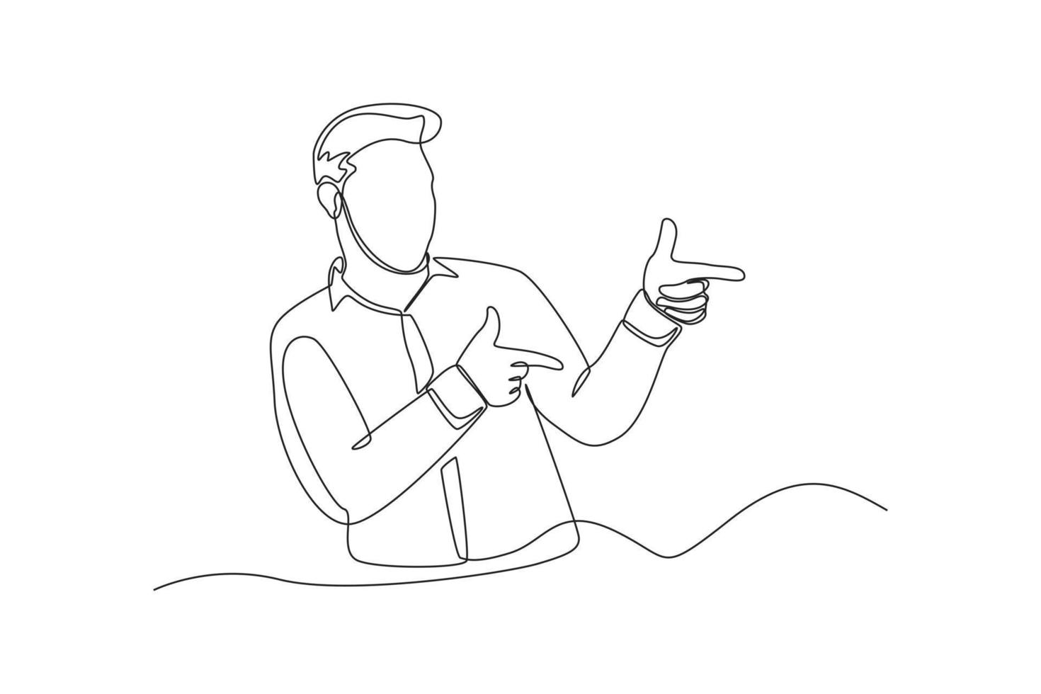 Single one line drawing businessman pointing with two hands and fingers to the side. Pointing concept. Continuous line draw design graphic vector illustration. Pro Vector