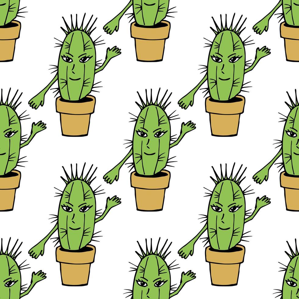 Seamless pattern with funny smiling cacti on white background. Vector image. Pro Vector