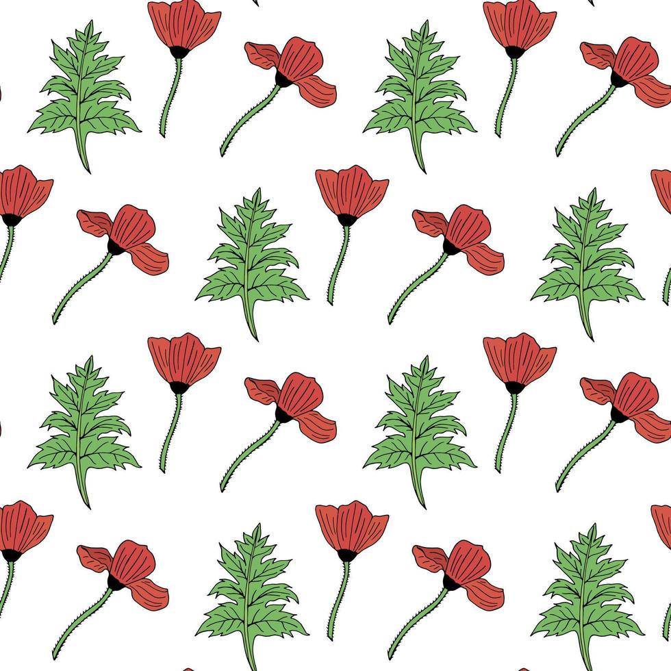 Seamless pattern with poppies and leaves on white background. Vector image. Pro Vector