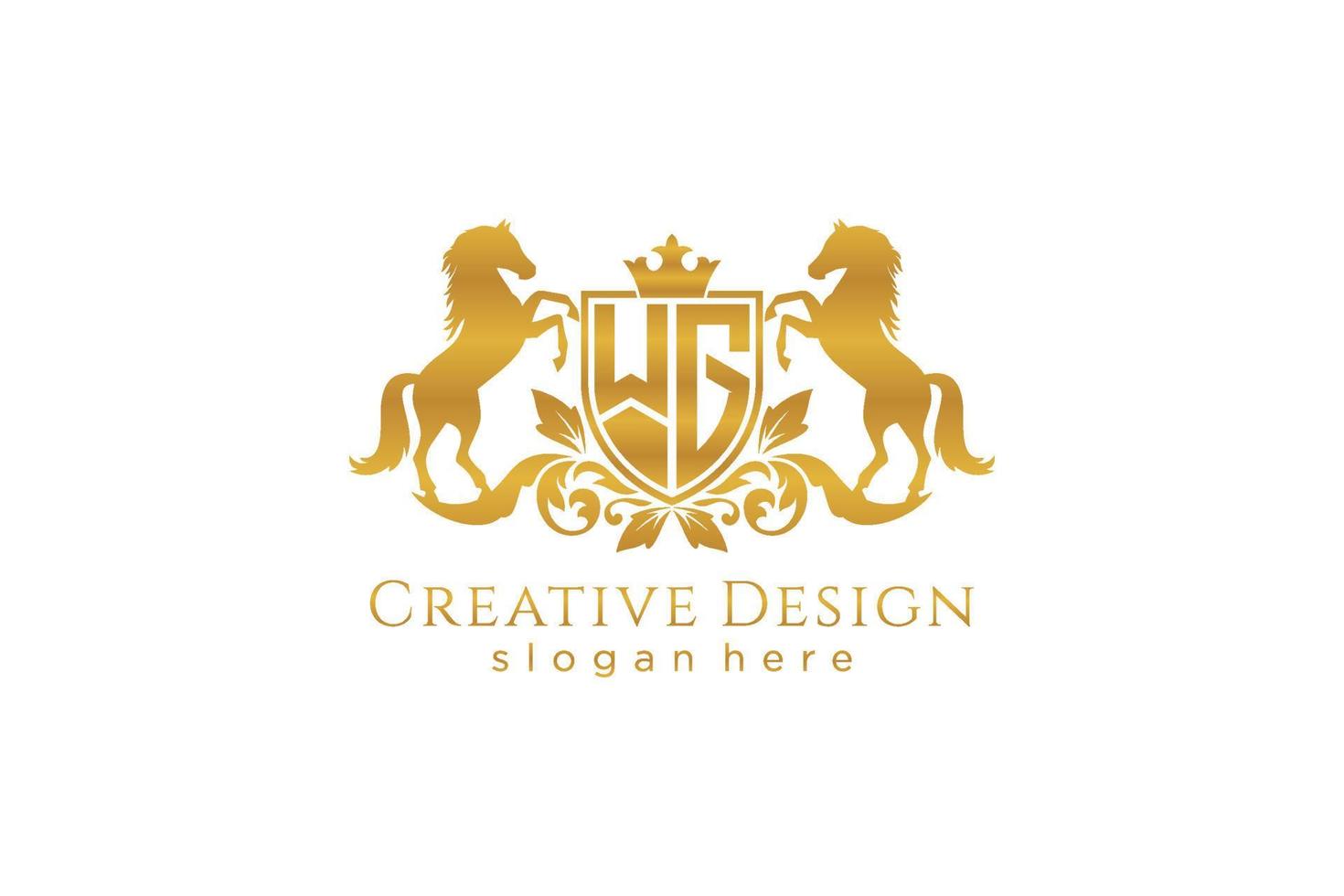 initial WG Retro golden crest with shield and two horses, badge template with scrolls and royal crown - perfect for luxurious branding projects Pro Vector and Pro SVG