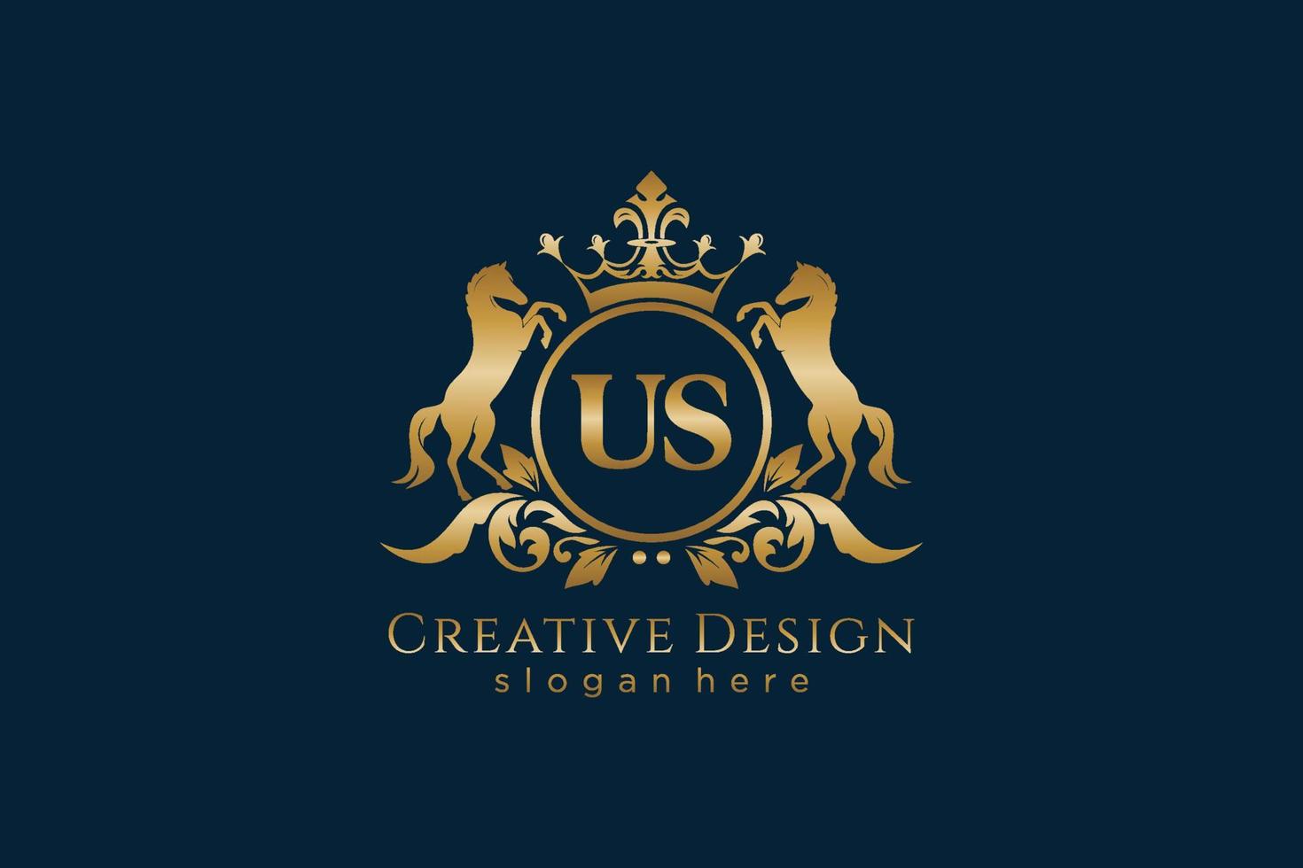 initial US Retro golden crest with circle and two horses, badge template with scrolls and royal crown - perfect for luxurious branding projects Pro Vector and Pro SVG
