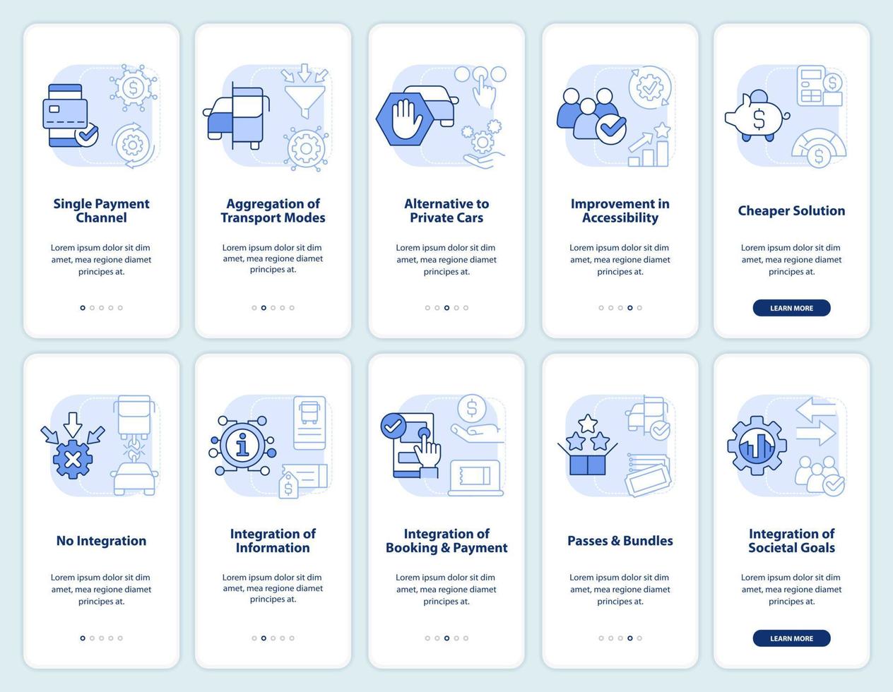 Mobility services light blue onboarding mobile app screen set. Urban walkthrough 5 steps editable graphic instructions with linear concepts. UI, UX, GUI template. Pro Vector