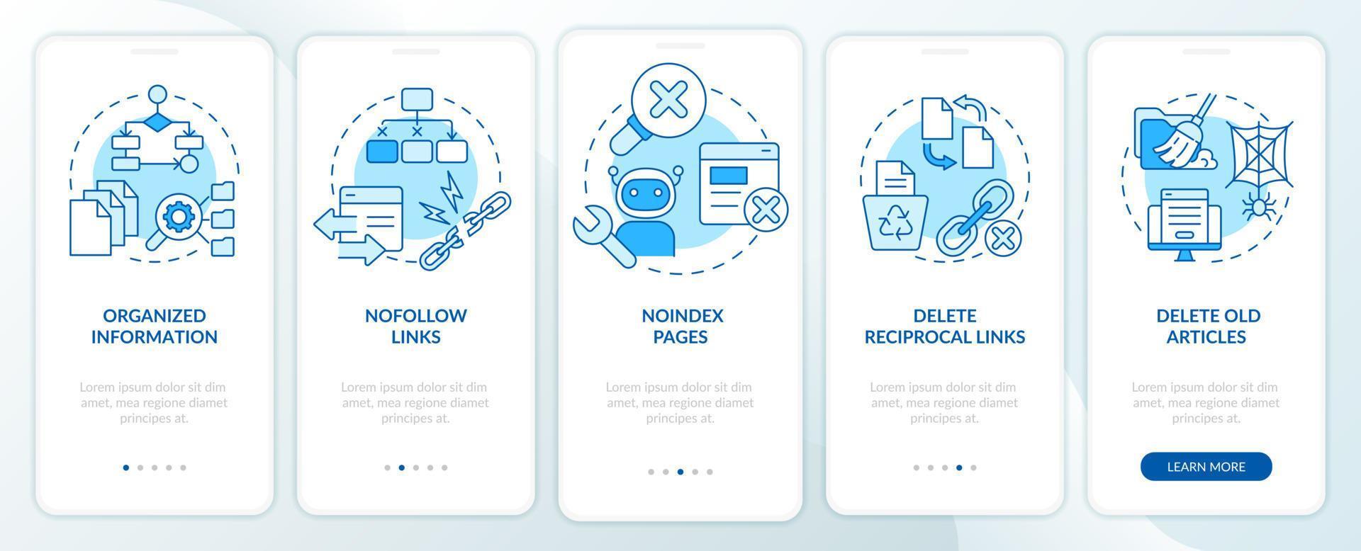 SEO principles blue onboarding mobile app screen. Website promotion. Walkthrough 5 steps editable graphic instructions with linear concepts. UI, UX, GUI template. Pro Vector
