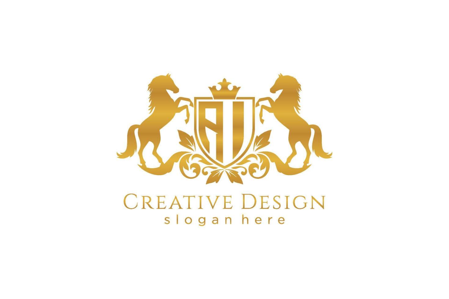 initial AI Retro golden crest with shield and two horses, badge template with scrolls and royal crown - perfect for luxurious branding projects Pro Vector and Pro SVG