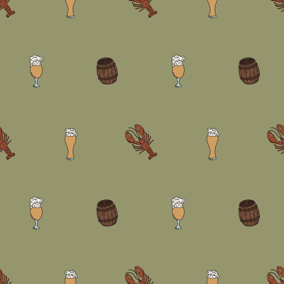 Seamless Pattern With Beer Mugs, Barrels And Crayfish. Background For Menu, Packaging, Bar Design. Pro Vector