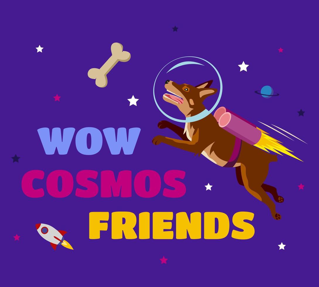 Vector illustration of a cute astronaut dog in a spacesuit floating in space with a dog bone. Vector illustration with text