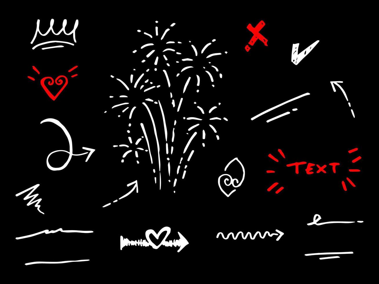 Vector hand drawn collection of design element. curly swishes, swoops, swirl, arrow, heart, love, crown, leaf, star, sun burst, firework, highlight text and emphasis element. use for concept design Pro Vector