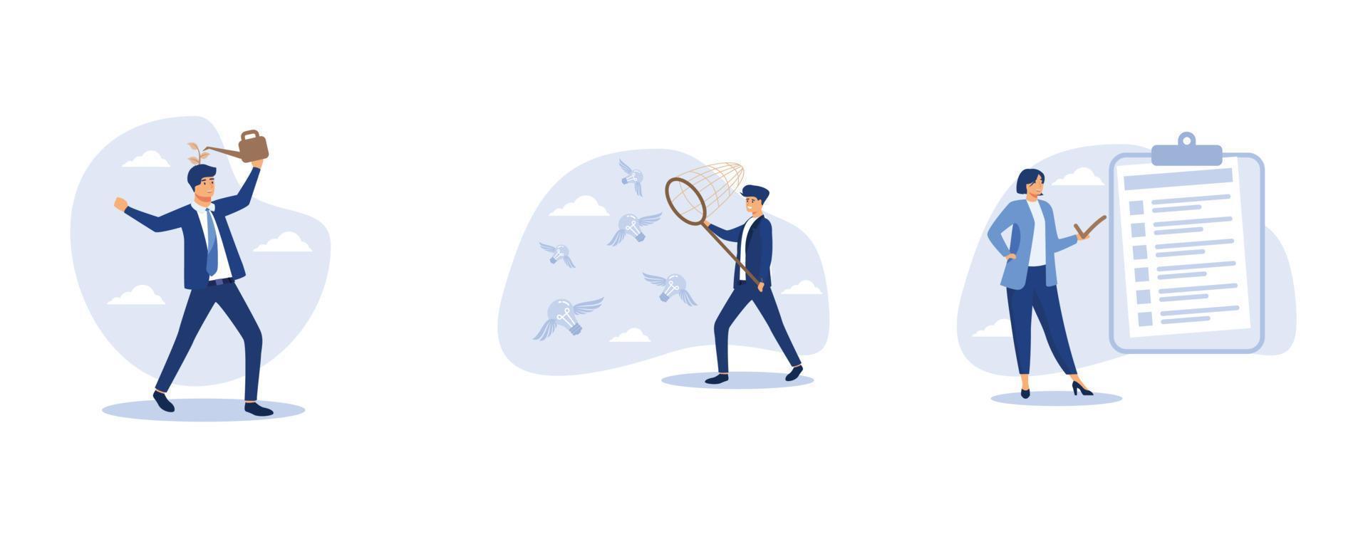 growth mindset, smart businessman chasing and catch flying lightbulb ideas with butterfly net, woman giving check on checkbox in achievement list notepad paper, set flat vector modern illustration Pro Vector