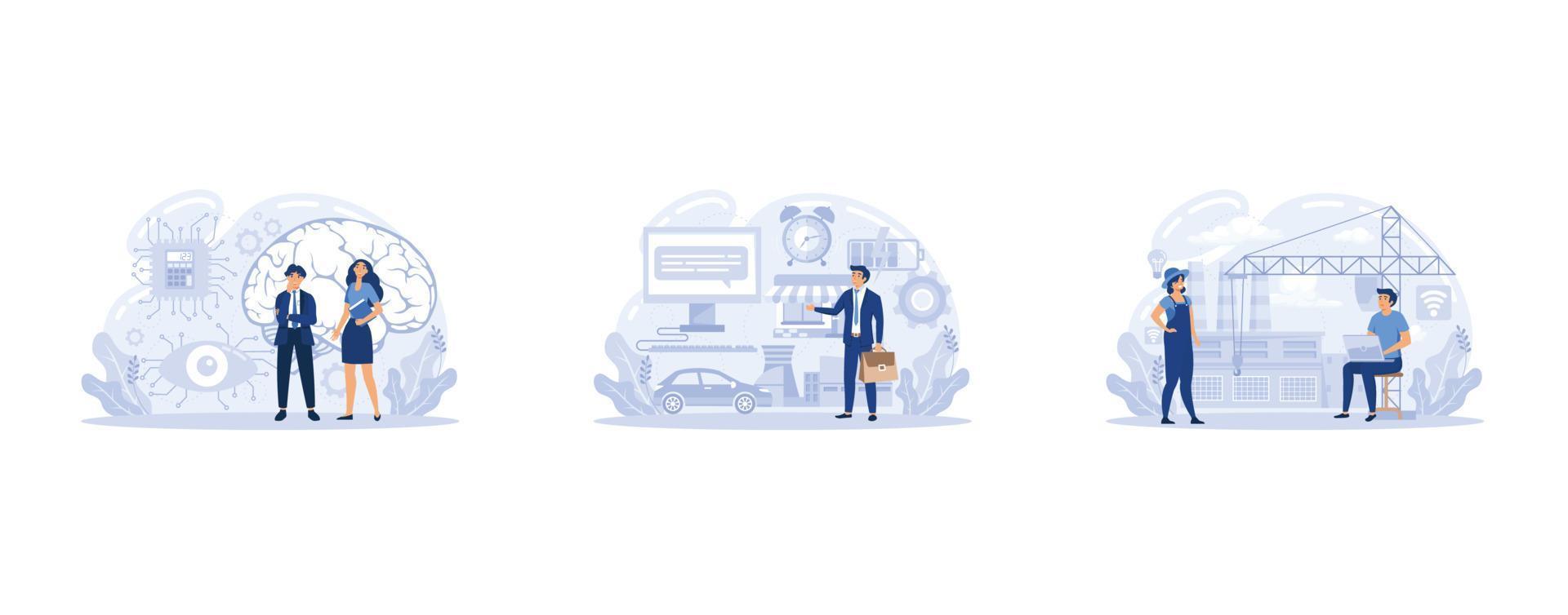 Futuristic factory work scheme. Industrial blockchain in manufacturing, Use artificial intelligence and Internet of things technologies in global production, set flat vector modern illustration Pro Vector