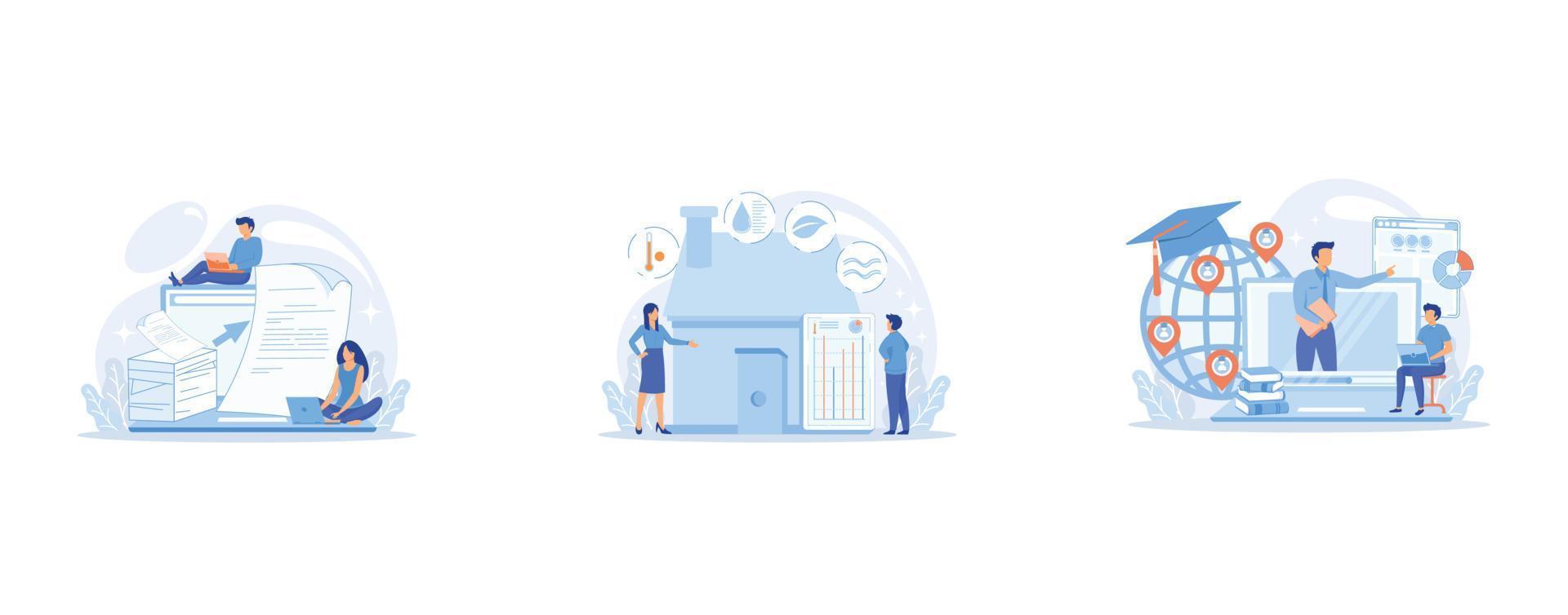 Specialists work with laptop digital data, tiny people, Home automation system, domotics, Distance university students flat characters watching tutorial video, set flat vector modern illustration Pro Vector