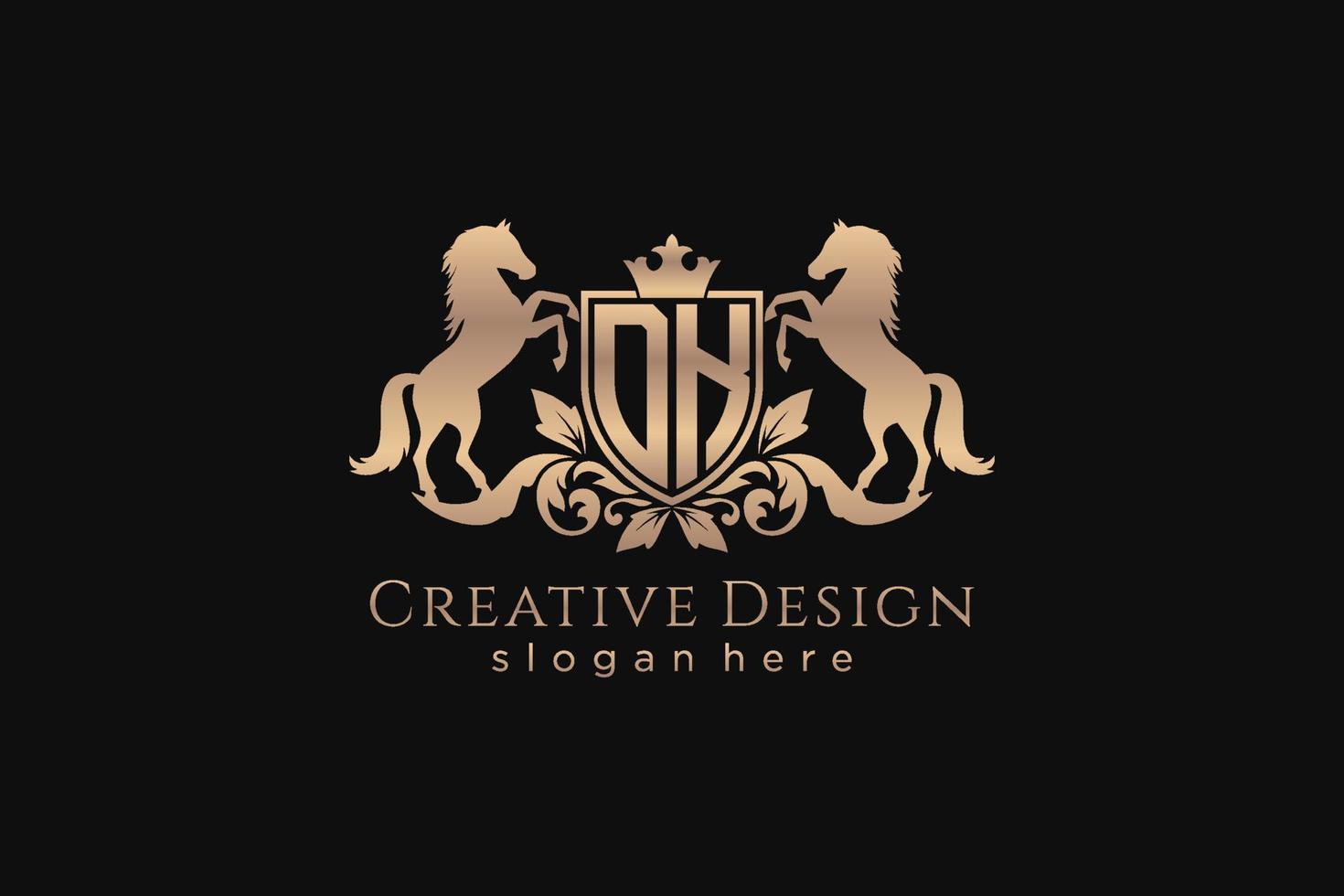 initial DK Retro golden crest with shield and two horses, badge template with scrolls and royal crown - perfect for luxurious branding projects Pro Vector and Pro SVG