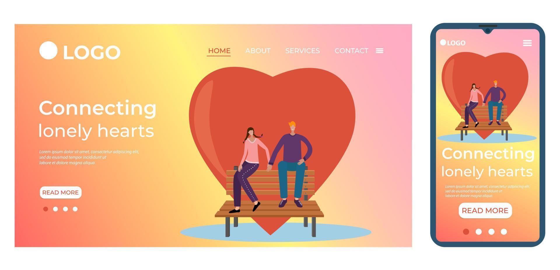 Connecting lonely hearts.People sit on a bench against the background of a heart.Template for the user interface of the site's home page.Landing page template.The adaptive design of the smartphone. Pro Vector
