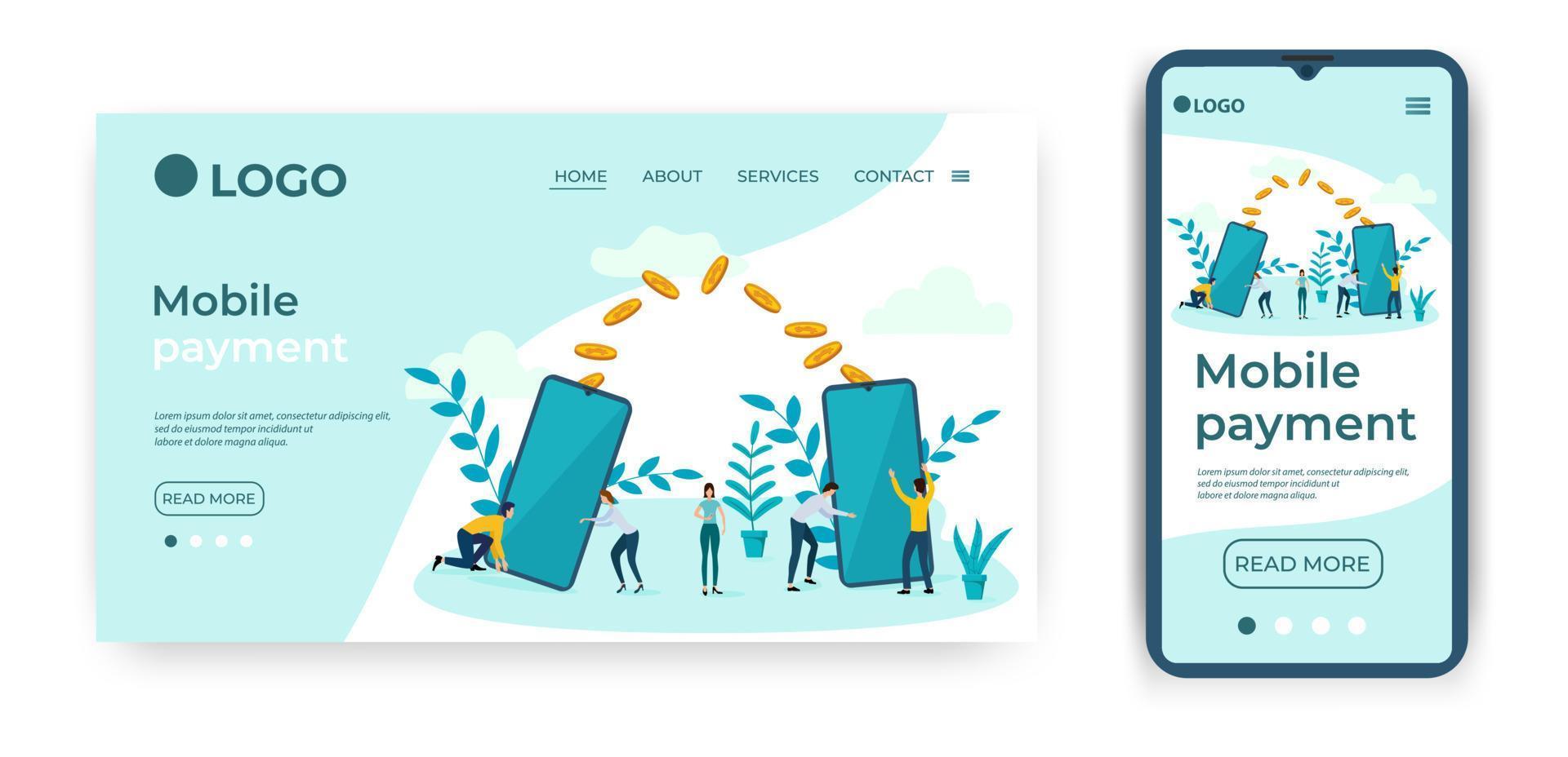Mobile payment. Template for the user interface of the website's home page.Landing page template.The adaptive design of the smartphone.vector illustration Pro Vector