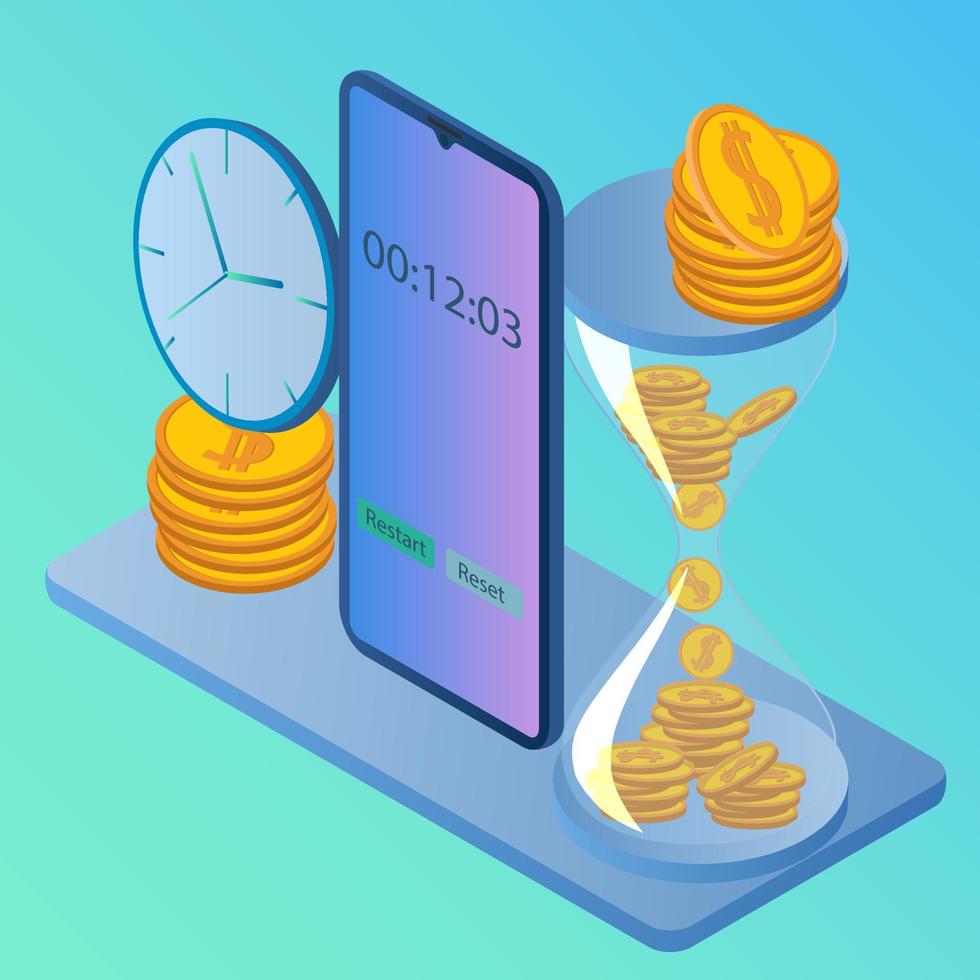 Time-management.Isometric view of the smartphone,the sand for hours and hours with money.Concept of time control and clock reconciliation .Vector illustration. Pro Vector