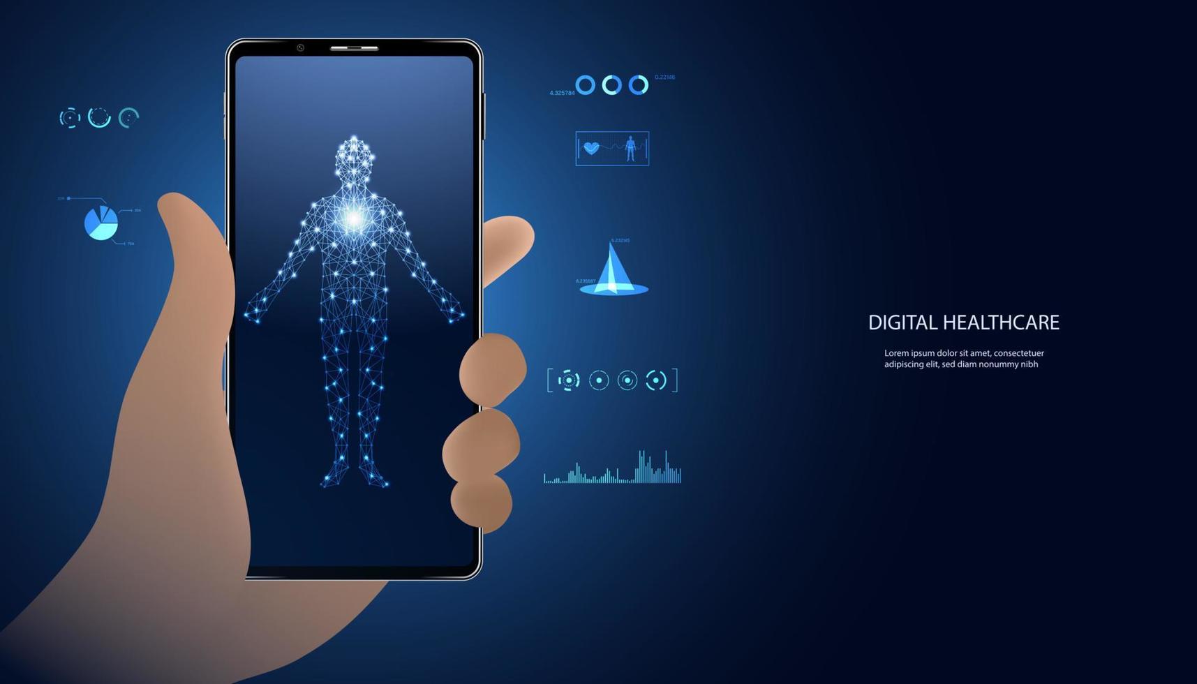 abstract hand holding a phone concept digital body Health processing using AI, health, measurement program, interface on modern background. Pro Vector