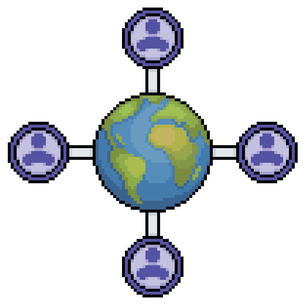Pixel art planet earth with profile icons, earth in network vector icon for 8bit game on white background Pro Vector