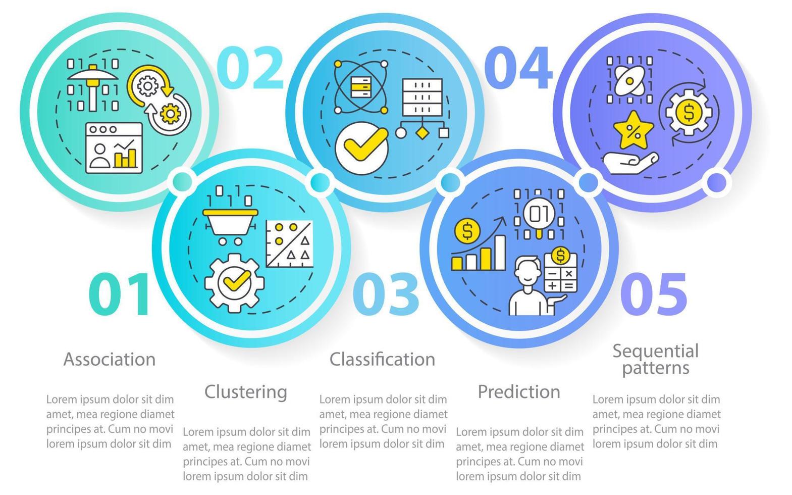 Data mining techniques circle infographic template. Digital processes. Data visualization with 5 steps. Process timeline info chart. Workflow layout with line icons. Pro Vector
