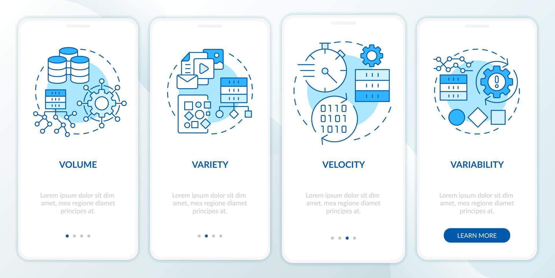 Characteristics of big data blue onboarding mobile app screen. Industry walkthrough 4 steps graphic instructions pages with linear concepts. UI, UX, GUI template. Pro Vector