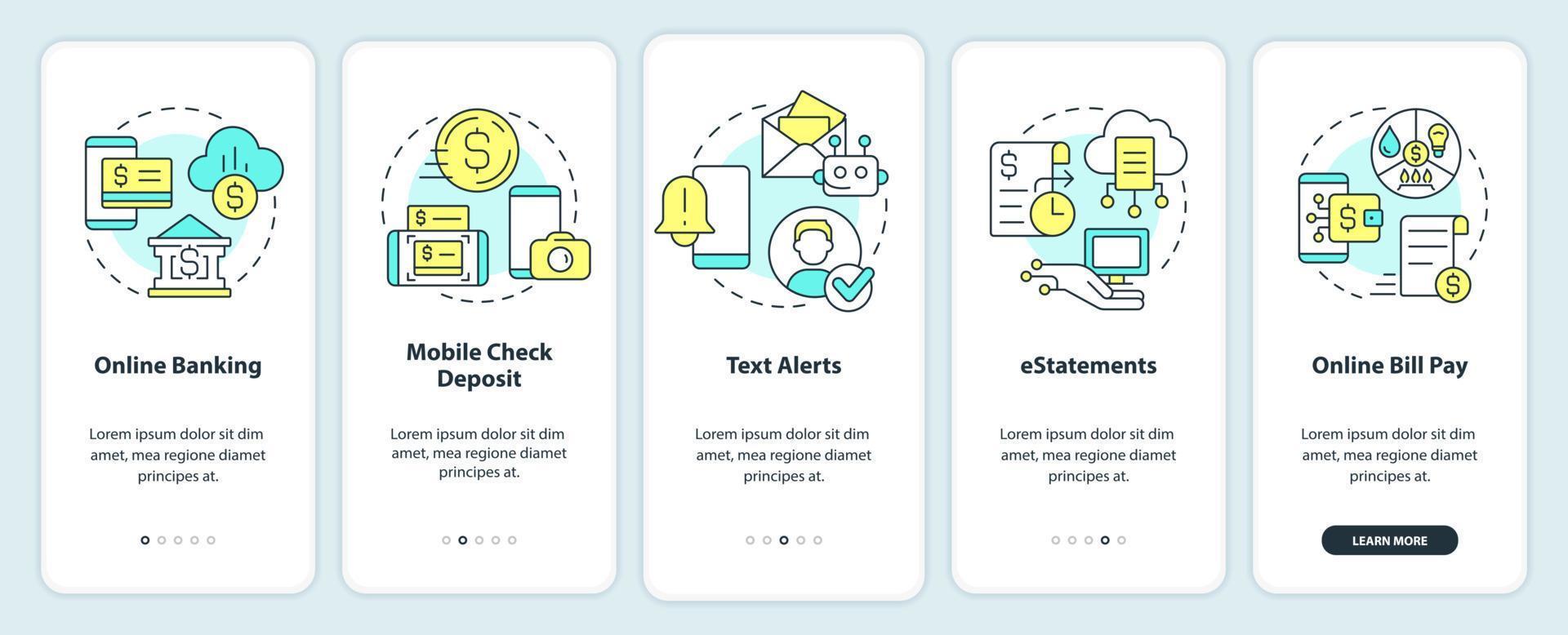 Digitization banking onboarding mobile app screen. Technology walkthrough 5 steps editable graphic instructions with linear concepts. UI, UX, GUI template. Pro Vector