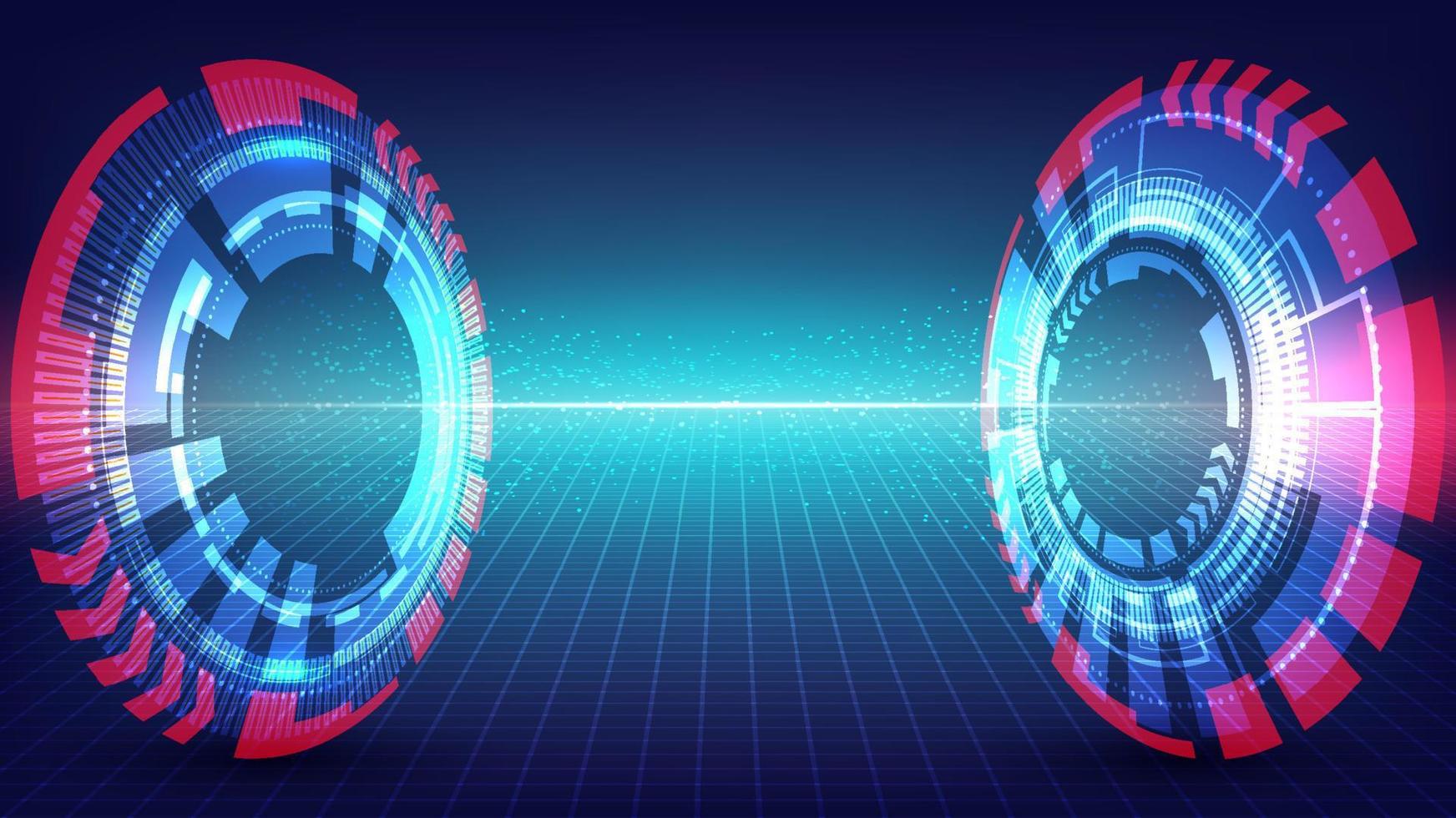 Abstract technology digital futuristic transfer big data concept blue HUD tunnel with lighting effect and particles on dark blue background Pro Vector