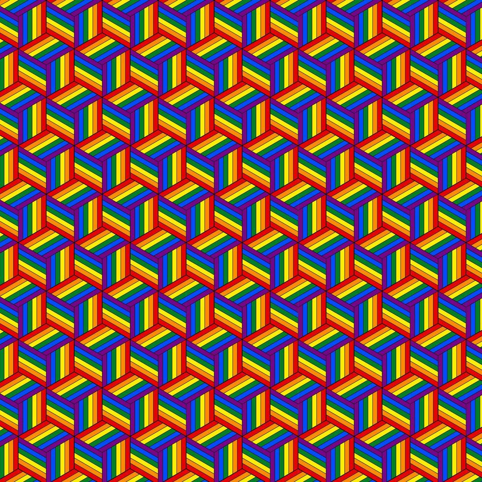 Vector illustration of wallpaper, background and flag with rainbow pattern. Geometric pattern of cubes with LGBT faces. Abstract geometric background. Pro Vector