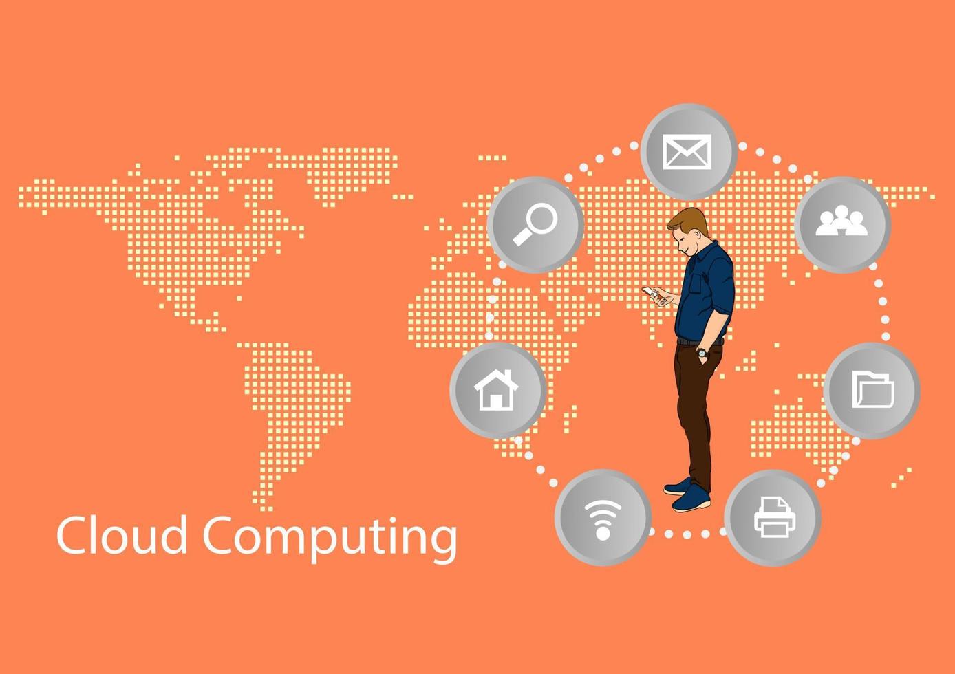 Graphics design Hitech Technology Cloud computing concept. Businessman holding smartphone connection online anywhere vector illustration Free Vector