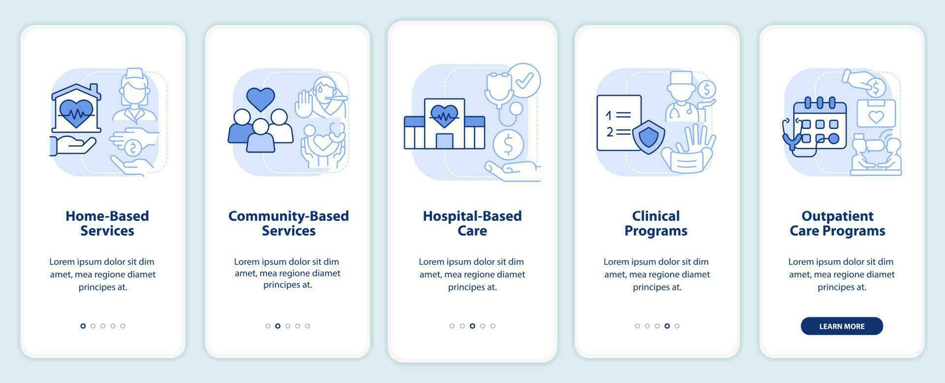 Medical care services light blue onboarding mobile app screen. Walkthrough 5 steps graphic instructions pages with linear concepts. UI, UX, GUI template. Pro Vector