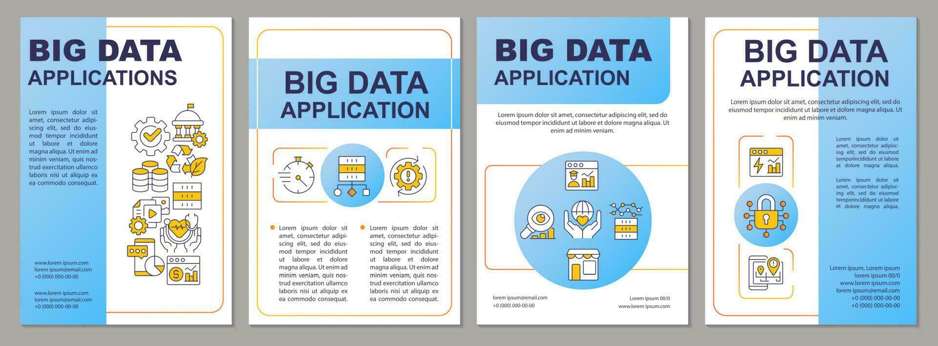 Applications of big data blue brochure template. User digital service. Leaflet design with linear icons. 4 vector layouts for presentation, annual reports. Pro Vector
