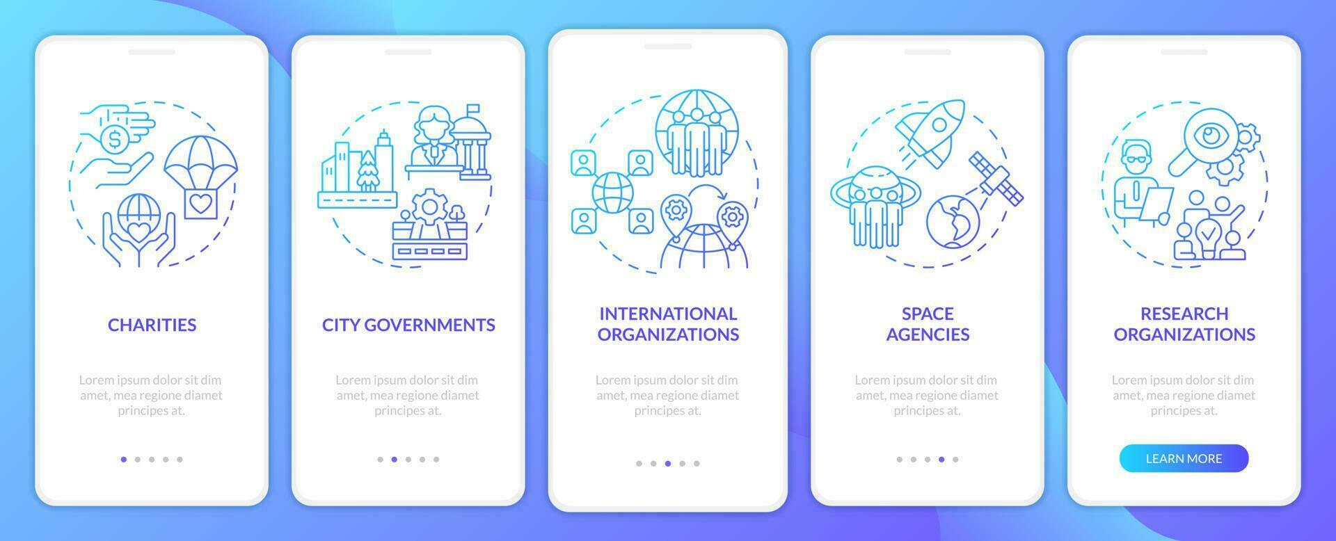 Institutions examples blue gradient onboarding mobile app screen. Walkthrough 5 steps graphic instructions pages with linear concepts. UI, UX, GUI template. Pro Vector