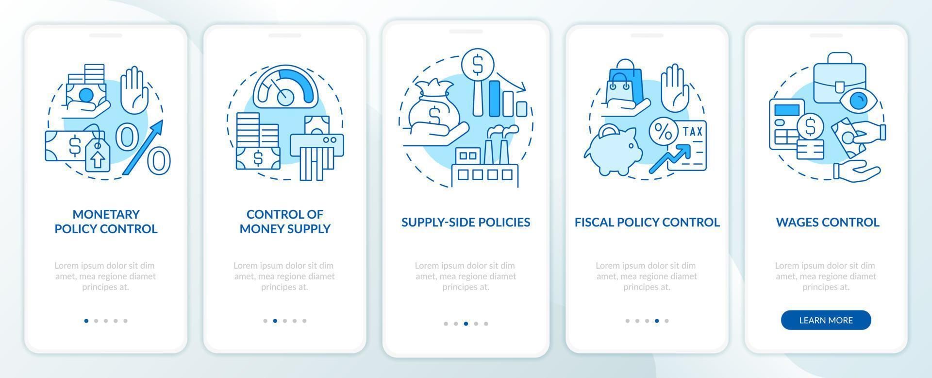 Controlling inflation blue onboarding mobile app screen. Walkthrough 5 steps editable graphic instructions with linear concepts. UI, UX, GUI template. Pro Vector